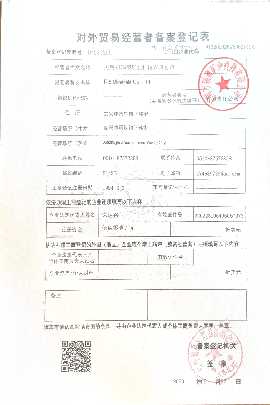 自身の輸出ライセンスを持っています 輸出ライセンス番号 : 04236209 輸出会社名 : Rio Minerals Co., Ltd ライセンスの写真 :